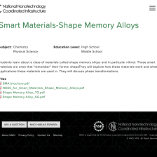 This experiment, presented by the National Nanotechnology Coordinated Infrastructure, covers Shape Memory Alloys or Smart Materials. A Smart Material or Shape Memory Alloys belongs to a class of materials which displays the shape memory effect (SME); they possess the ability to radically change crystal structure or phase at a distinct temperature. The lab will "explore how smart materials work and what applications these materials are used in." Additionally, students will be provided with a brief history lesson about the origins of smart material. The experiment is quite fun, students will observe how smart materials can "think and do amazing things." A student and teacher guide is provided with the lab.