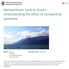 This lab, presented by the National Nanotechnology Coordinated Infrastructure, introduces students to the intersection between plastics, nanotechnology, and aquatic ecosystems. During the lab, students will "model how nanoparticle pollution travels from land to water. This lab is part 1 of a 2-part series of labs designed to help students understand the effect that nanoscale pollutants have on aquatic ecosystems." Included in this lab are: two teaching guides, two student guides, two student guides with answers, and the Next Generation Science standards for this lesson. The lab will take one 55 minute class session to complete.