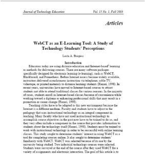 This paper, from Lesta A. Burgess, Assistant Professor in the Industrial Technology Department at the University of Northern Iowa, Cedar Falls, covers the online courseware tool WebCT, and its use in technology education classrooms. The paper gives some background to both distance learning as well as internet-based learning, before getting into the authors own study of WebCT.