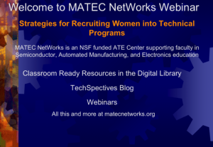 These presentation slides, made available by Maricopa Advanced Technology Education Center (MATEC), describe some strategies for recruiting women into technology programs at educational institutions. This presentation was given by Celeste Bain, author of Is There an Engineer Inside You: A Comprehensive Guide to Career Decisions in Engineering. Included in the presentation is information about why some women choose not to enter the technology field, detailed descriptions of six recruitment strategies, as well as additional tips and suggestions.