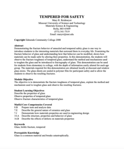 This seven-page guide from Edmonds Community College provides an instructional module on tempered safety glass. In this activity, the instructor demonstrates the fracture toughness of tempered glass. This demonstration shows how glass is toughened and introduces the concept of the fractography of glass to students. This activity introduces basic engineering design and materials science concepts. The module can be adjusted for use in classrooms from the elementary school to college level. This guide includes the following sections: Student Learning Objectives, MatEd Core Competencies Covered, Equipment and Supplies Needed, Curriculum Overview, Module Procedure, and an Evaluation Packet.