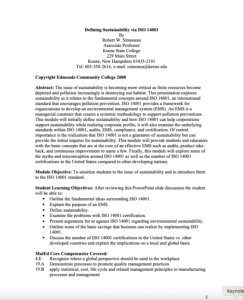 This four-page instructor guide from Edmonds Community College provides a lesson plan introducing to ISO 14001, an international standard encouraging sustainable product design. This lesson plan explores concepts that form the framework of ISO 14001 and how this standard impacts sustainability in industry. The lesson includes an instructor presentation and a discussion. This lesson is designed for one 45-minute class period, and is intended for high school and first year college classrooms. This guide includes the following sections: Student Learning Objectives, MatEd Core Competencies Covered, Equipment and Supplies Needed, Curriculum Overview, Module Procedures, Supporting Materials, and an Evaluation Packet.