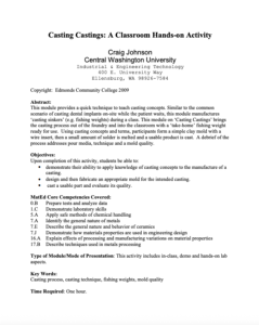 This eight-page guide from Edmonds Community College outlines a one-hour laboratory activity demonstrating casting concepts. Students design and fabricate a clay mold to cast a usable fishing weight, or "casting sinker." This activity demonstrates how "materials properties are used in engineering design." The guide includes step-by-step instructions for the activity, with color photographs included. This document includes the following sections: Objectives, MatEd Core Competencies Covered, Equipment and Supplies Needed, Curriculum Overview, Module Procedure, and Evaluation Process.