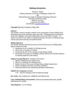 This five-page guide from Edmonds Community College provides a lesson plan introducing students to foundational metal welding concepts. The lesson demonstrates welding techniques using video clips, and introduces welding processes, issues, and effects. Students learn about the basic welding concepts of flux, gas coverage, weldability, and the heat-affected zone. This lesson was designed for advanced high school and community college classrooms, and takes 15-30 minutes. The instructor guide includes the following sections: Module Objectives and Student Learning Objectives, MatEd Course Competencies Covered, Equipment and Supplies Needed, Curriculum Overview, Supporting Videos, and an Evaluation Packet.