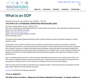 This page describes Standard Operating Procedures (SOPs) and their component sections and provides examples of a SOP for students to review. Documentation, that is, a system of written records, is essential in all laboratories and production environments. A Standard Operating Procedure (SOP) is a certain type of document that describes in a step-by-step outline form how to perform a particular task or operation. Everyone in a company must follow the same procedures to assure that tasks are performed consistently and correctly. Most companies have a wide variety of SOPs that describe how to do different tasks. In many companies technicians and operators are trained in how to follow individual SOPs and their training record specifies which SOPs they are trained on and are authorized to use. There is no federally approved format for a SOP but there are expectations within the industry as to how a SOP should be written. The SOP is written in imperative sentences rather than a narrative style. A cookbook format is used and sentences should start with a task specific verb that tells what to do. The instructions are numbered in the order that they will be followed.
