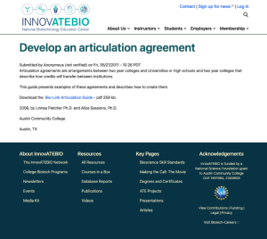 Articulation agreements are arrangements between two year colleges and Universities or high schools and two year colleges that describe how credits will transfer between institutions. This guide presents examples of these agreements and describes how to create them. The guide may be downloaded in PDF file format.