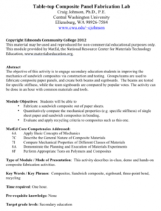 This lab experiment requires students to improve the mechanics of sandwich composites via construction and testing. Teams of students will "fabricate composite paper panels, and create both beams and signboards." The lesson can be completed within an hour. This activity would be appropriate for high school level students. This document will serve as a framework for instructors and may be downloaded in PDF format.