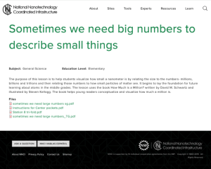 This lesson, presented by the National Nanotechnology Infrastructure Network, covers the general concepts of number size by introducing the size of the nanometer. From there, students discuss and visualize the concepts of millions, billions, and trillions in an effort to " lay the foundation for future learning about atoms in the middle grades.