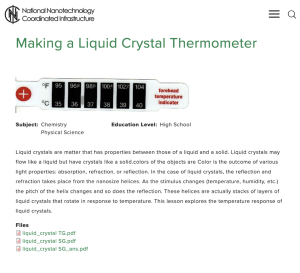 This lab, presented by the National Nanotechnology Coordinated Infrastructure, introduces students to the temperature response of liquid crystals, and how they respond in different phases of matter. In addition to liquid, solid, and gas, the fourth phase of matter includes liquid crystals which "have the particles arranged in a helix, and the color reflected from the liquid crystal depends on the pitch of tightness of the helix. The pitch, which changes with temperature, equals the wavelength of the light reflected which creates the color of the liquid." This can be found in nature, and is also in digital displays. In this lab, students will examine the changes in liquid crystal color and behavior when heat is applied. Included in this lab are a teacher preparation guide, student guide, and a student guide with answers.