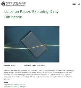 This lab, presented by the National Nanotechnology Coordinated Infrastructure, allows students to "understand how light is bent into different directions as it interacts with small objects, especially those on the nanoscale (1-100nm)." Additionally, students will learn about the process of x-ray diffraction which allows scientists to see structures that are too small to see with the naked eye, including atoms, molecules, and crystal structures. In this lab, students will create and explore their own diffraction gratings with a series of worksheets. Included in this lab are: Student Worksheet 1 Laser Box with answers, Student Worksheet 2 Interference Patterns with answers, Student Worksheet 3 Grating with answers, Student Worksheet 1 Laser Box, Student Worksheet 2 Interference Patterns, Student Worksheet 3 Grating, and Handout to make grating.