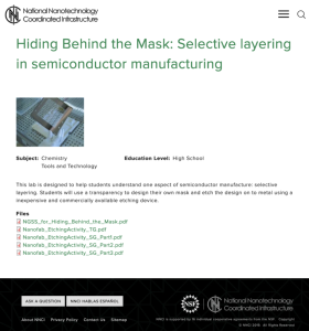 This lab, presented by the National Nanotechnology Coordinated Infrastructure, covers the concept of semiconductor manufacturing. Students will learn about selective layering which is used to "build up some layers of patterned material so that very interesting things start to happen, like using voltage in one conducting part to control electron flow in a neighboring part—the basis of transistor switches." A Teacher Preparation Guide, Student Guides, and Next Generation Science Standards applicable to the lesson are included.