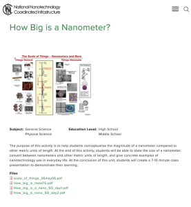 This lab, presented by the National Nanotechnology Coordinated Infrastructure, covers the concept of measurement on the nanoscale. During this exercise, students will learn about the size of a nanometer, converting between nanometers and other units of length, and giving examples of real life nanotechnology use.