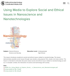 This lesson, presented by the National Nanotechnology Coordinated Infrastructure, introduces the social and ethical issues of nanotechnology. In this activity, students will explore "possible social issues through case studies using popular films, books, and news stories. The lesson is intended to stimulate discussion about social and ethical issues related to nanotechnology as well as, in a broader context, the interaction of science and technology with society." This activity will take one 50 minute classroom session. A Teacher Preparation Guide, Student Guide, and Next Generation Manufacturing Standards for this lesson are included.