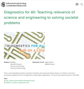 This lesson, presented by the National Nanotechnology Coordinated Infrastructure, focuses on diagnostic methods of investigation looking at the issue of HIV/AIDS. In this activity, students will explore "the societal impacts of engineering and science, specifically as it relates to the AIDS epidemic in developing countries. The activity highlights the development of low-cost paper diagnostics for rapid and private diagnosis of AIDS and diseases related to AIDS (TB, other sexually transmitted diseases, etc.)." This activity will take two 50 minute classroom sessions. A Teacher Preparation Guide, Next Generation Science Standards for this lesson, and a link to George Whitesides video used in lesson video from the NY Times are included.