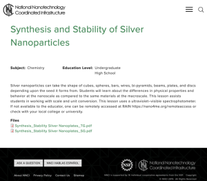 This lab, presented by the National Nanotechnology Coordinated Infrastructure, uses silver nanoplates as a tool to explore the relationship between shape and optical properties. Students will be able to compare material properties and behaviors at both the nano- and macroscale through the exercise, as well as experience with scale and unit conversion. A 'Teacher's Preparatory Guide' is included, featuring needed materials, detailed procedural instructions, and additional resources. A 'Student Guide' includes detailed, step-by-step instructions, space for recording data, and analysis questions.