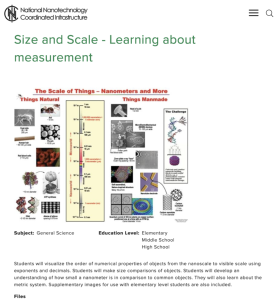 This lesson, presented by the National Nanotechnology Coordinated Infrastructure, is designed to introduce middle and older elementary students to nanoscale objects by comparing them in size to the visible world. Students will receive an introduction to exponents, decimals, and the metric system through these size comparisons. The included Teacher's Preparatory Guide details needed materials and instructions for the lesson, as well as a list of additional useful resources to assist students in comprehension. Two additional files include those materials to print for the activity: scale indicators and a PowerPoint file with images.