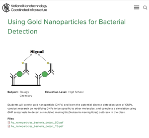 This lab, presented by the National Nanotechnology Coordinated Infrastructure, teaches students about gold nanoparticles (GNPs). Students will "learn the potential disease detection uses of GNPs, conduct research on modifying GNPs to be specific to other molecules, and complete a simulation using GNP assay tests to detect a simulated meningitis outbreak." A Teacher's Preparatory Guide and Student Worksheet are provided that give detailed guidance for completing the lab.