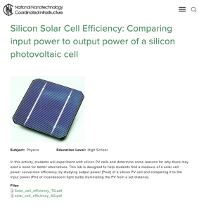 This lab, presented by the National Nanotechnology Coordinated Infrastructure, teaches students how to measure the efficiency of a solar cell. Students will compare the output power of a silicon PV cell with the input power of incandescent light bulbs illuminating the PV from a set distance. A Teacher's Preparatory Guide and Student Worksheet are provided that give detailed guidance for completing the lab.