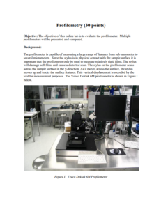 This resource, provided by Nanotechnology Applications and Career Knowledge Support Center (NACK Center), includes a lab sheet and video lesson on profilometry and the profilometer. The 3-page lab sheet provides necessary background information for students to evaluate and compare profilometers. The video introduces profilometry and walks through the components, setup, and operation of a profilometer. Conducting a scan with a profilometer is also demonstrated.