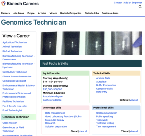 This page from Bio-Link's career website features information about the different jobs and opportunities in the genomics technician career area. This page includes a brief description of genomics technicians, who "use a range of technologies related to determining and comparing DNA and RNA sequences. They isolate RNA and DNA from samples. They construct libraries, perform quality control, carry out titrations, and work with a variety of microarray, PCR, and DNA sequencing technologies." Common tasks, education and training requirements, related biotechnology areas, videos from professionals, and wages are highlighted.