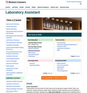 This page from Bio-Link's career website features information about the different jobs and opportunities in the laboratory assistant career area. This page includes a brief description of laboratory assistants. Common tasks, other job titles, education and training requirements, related biotechnology areas, videos from professionals, and wages are highlighted.