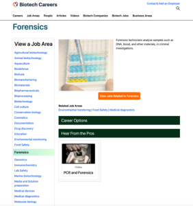 This page from Bio-Link's career website features information about the different jobs and opportunities in the forensics career area. This page includes a brief description of the forensics field, and links to related career areas, jobs in the field, and videos. A featured job in the forensics field is a genomics technician.
