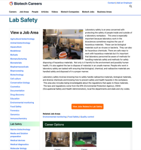 This page from Bio-Link's career website features information about the different jobs and opportunities in the lab safety career area. This page includes a brief description of the lab safety field, which "is an area concerned with protecting the safety of people inside and outside of a laboratory workplace." Links to related career areas are included.