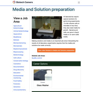 This page from Bio-Link's career website features information about the media and solution preparation career area. This page includes a brief description of media and solution preparation and its importance to laboratory experiments. Links to related career areas are also included, as well as links to articles, alumni profiles, and videos. Jobs in the media and solution preparation area include laboratory assistant and glass washer.
