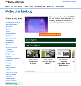 This page from Bio-Link's career website features information about the different jobs and opportunities in the molecular biology career area. This page includes a brief description of the molecular biology field, which "involves working with DNA, RNA, cells, and/or proteins." Links to related articles, jobs, alumni profiles, and videos are provided. Related jobs include molecular biology technician, glass washer, genomics technician, and laboratory technician.