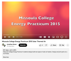This video is provided by Missoula College and shows a presentation given by energy practicum students on the creation of solar thermal air collectors (STAC's). The students describe the basic design, different types of STAC's, materials used to build the STAC's, and demonstrate how they are built and work. The parts were printed on a 3-D printer. This video runs 14:38 minutes in length.
