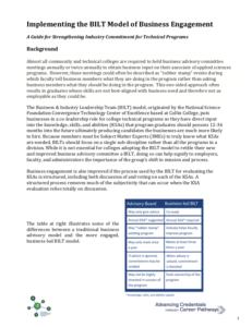 This 16-page resource, provided by the Center for Occupational Research and Development (U.S.), is a guide for implementing the BILT (Business & Industry Leadership Team) Model of Business Engagement. This model "... puts businesses in a co-leadership role for college technical programs so they have direct input into the knowledge, skills, and abilities (KSAs) that program graduates should possess 12-36 months into the future ultimately producing candidates the businesses are much more likely to hire."