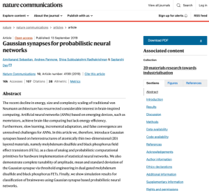 This 11-page article, from Nature Communications, discusses probabilistic neural networks (PNNs) that can improve computing power through energy scaling, size scaling, and complexity scaling. The authors highlight how 2D materials enable aggressive size scaling, analog Gaussian synapses support energy-efficient computation, and PNNs drive complexity scaling. Combined, these developments can facilitate exascale computing and ultimately benefit scientific discovery, national security, energy security, economic security, infrastructure development, and advanced healthcare programs." Other topics covered in this article include brainwave patterns, device fabrication and measurements, and EEG data.