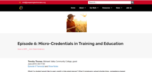 This podcast episode, published by the Center for Occupational Research and Development, is part of a series that covers issues and topics on technician development. In this episode, Timothy Thomas illustrates the importance of the micro-credential, a sequence of 9-15 credit hours, often three courses, designed to facilitate the attainment of a single competency. Thomas discusses the process and difficulties in implementing this at Mohawk Valley Community College.