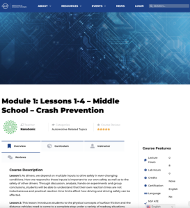 This learning module, from the National Center for Autonomous Technologies (NCAT), provides four lessons on crash prevention for Middle School students. Lesson one explores how reaction times affect driving and driving safety. Lesson two explores stopping distance and the physical concepts of surface friction according to pavement types, and highlights the Intelligent Transportation System (ITS) sensors and communication networks. Lesson three explores how weather conditions affect driving. Lesson four explores traffic congestion and technologies used to inform drivers of road conditions. Learning outcomes include some of the following: