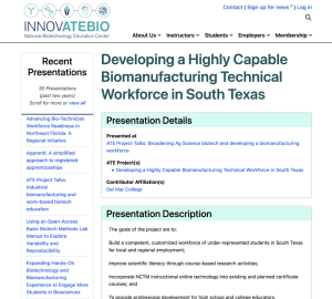 In this webinar, published by InnovATEBIO, J. Robert Hatherill and Daiyuan Zhang discuss Del Mar College's biomanufacturing ATE project. Del Mar College's biotechnology program, a biopharmaceutical and vaccine manufacturing training program, biotechnology degree requirements, internship outcomes, student assessment data, other biomanufacturing areas for hands-on training, and industry partner recommendations are highlighted. The video recording runs 34:22 minutes in length.