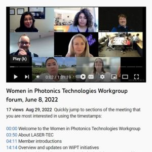 This video is a recording of a virtual forum that explores the perspectives and experiences of women professionals in the photonics technologies field. In the video, the Women in Photonics Technologies (WiPT) Workgroup, LASER-TEC, and WiPT initiatives are described. Panel members also provide educational and professional background information. Desire Whitemore also provides a presentation that explores the academic and career journey of a woman in photonics. Forum participants also discuss aspects of the optics and photonics field, such as similarities in personal experiences with pursuing photonics, challenges, research, and how to build engaging photonics programs that help recruit and retain female students. The video recording runs 1:01:19 minutes in length.