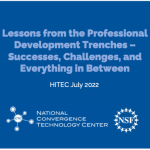 This presentation slide deck, provided by the National Convergence Technology Center (CTC), highlights key strategies and best practices for successfully planning and delivering a professional development event. Communication, technical support, no-shows, hosting best practices, surveys, certificates, and lessons learned are highlighted. Mark Dempsey from the CTC at Collin College used these slides at the summer 2022 HI TEC conference in Utah for a workshop.