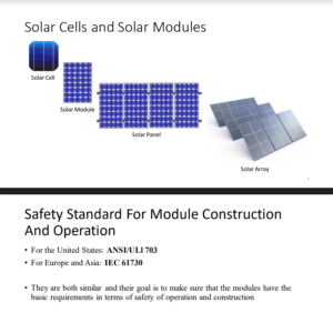These lecture slides from the Renewable Energy Systems Training (REST) Laboratory Development and Workforce Training project provide information on solar cells and modules. A safety standard for module construction and operation, test conditions, operating temperatures, a panel datasheet, measurements, I-V curves, factors that affect a photovoltaic (PV) panel, shading, and blocking diodes are highlighted. Educators may use these slides for their solar energy curriculum.