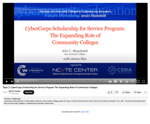 This video is provided by Whatcom Community College and is the second topic of the Future Direction: 2021 Summit that was held on October 19-21, 2021. The Summit explored the role of community colleges in cybersecurity education. This video features James Rice interviewing Kim C. Muschalek, Instructor at San Antonio College. During the interview, Muschalek discusses the Summit Cyber Corps Scholarship For Service program: Expanding the Role of Community Colleges.