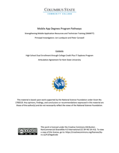 This resource, provided by Columbus State Community College, shows the high school and 4-year pathways available for Mobile App Degree AAS degree programs. Information is provided for the High School Dual Enrollment through College Credit Plus IT Explores Program and the articulation agreement for Kent State University.