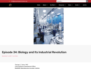 This podcast episode, published by the Center for Occupational Research and Development, is part of a series that covers issues and topics on technician development. In this episode, Michael Lesiecki and guest Tom Tubon of BioMADE "... discuss how BioMADE is catalyzing collaboration and innovation to help develop and expand the future workforce for industrial biotechnology."