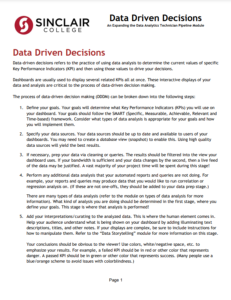 This document from Sinclair Community College explores data driven decision making (DDDM). The process of DDDM is described, which includes defining goals, specifying data sources, cleaning and querying data, and more. Data driven decisions in industry, high quality data, and other resources about DDDM are also highlighted.