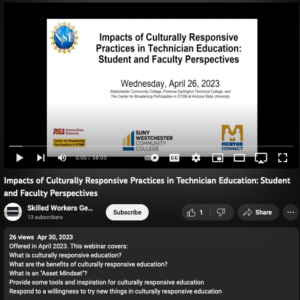 This video provides student and faculty perspectives on the impacts of culturally responsive education in technician education. A definition of culturally responsive education, its benefits, asset mindsets, tools and inspiration for culturally responsive education, and the importance of trying new things are highlighted. A cultural collage activity is also explored. The video recording runs 58:05 minutes in length.