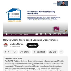 This video from Florida Advanced Technological Education Center for Manufacturing (FLATE) provides a panel discussion that covers work-based learning options, including their benefits and challenges. Apprenticeships, internships, and OJT are covered. Panelists from Florida manufacturing companies provide details of their working partnerships. Lee Chipps-Walton also provides an overview of work-based learning, including its benefits and outcomes. The video recording runs 59:14 minutes in length.