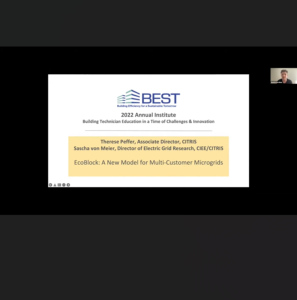 This presentation, from the Building Efficiency for a Sustainable Tomorrow (BEST) Center, is from the BEST Center's 2022 Annual Institute. Presenters Alexandra von Meier and Therese Peffer discuss the Ecoblock project, which aims to combine energy efficiency with a 100% solar microgrid at the block-level in Oakland, California. The primary goal is to make clean energy accessible in lower-income areas while granting community members control over their own energy systems, increasing community resiliency against grid outages. Discussed in the presentation are the many challenges the project faces, such as economic issues and the need to gain the community's trust, ways to begin scaling-up the project in scope, and more.
