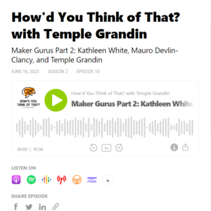 This podcast is hosted by Temple Grandin and is provided by the STEM Action Center. This podcast features STEM professionals discussing their work and the benefits of a multifaceted approach to STEM education. During episode ten of season two, Temple Gradin speaks with educators Maura Devlin-Clancy and Kathleen White who "developed Makerspace experiences and new ways of teaching to help recruit and grow a diverse teaching workforce." "White and Mauro Devlin-Clancy also discuss some of the challenges educators are facing in this new uncharted era of Chat GPT and why makerspaces should be geared for everyone." This episode is part two of two.