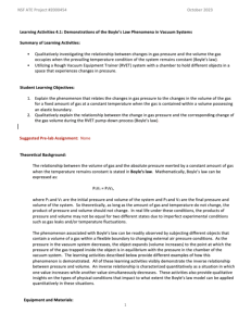 This 6-page learning activity is from the Introduction to Vacuum Technology Student and Instructor Laboratory Manuals that accompany the Introduction to Vacuum Technology E-Book published by Erie Community College. This activity has students "measur[e] the volume of two sample materials, shaving cream and marshmallows, at atmospheric pressure and a vacuum pressure level." Students also use pressure and volume data to verify Boyles' law.