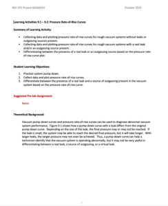 This 9-page learning activity is from the Introduction to Vacuum Technology Student and Instructor Laboratory Manuals that accompany the Introduction to Vacuum Technology E-Book published by Erie Community College. The learning activity has students measure pump-down time and pressure changes during the rough vacuum system pump-down process to plot rate-of-rise curves. Students will then analyze the rate-of-rise curves to identify real and virtual leaks.
