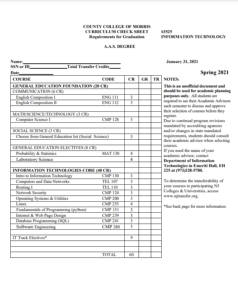 These three program check sheets, published by County College of Morris, provide the requirements and optional classes for three programs at County College of Morris (CCM): the Associate degree in Computer Science with the Data Science Option, the Data Analytics Certificate of Achievement, and the Associate of Applied Science degree in Information Technology. Each sheet lays out the required and optional courses, a recommended schedule for completing the program, and various program tracks, if applicable. Each check sheet is two pages.