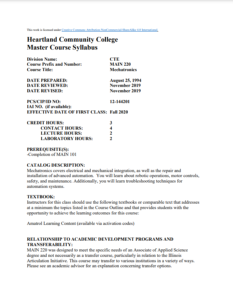 This 4-page syllabus, published by Heartland Community College (HCC), provides information about the Mechatronics course taught at HCC. The course focuses "electrical and mechanical integration, as well as the repair and installation of advanced automation." Throughout the course, students learn about robotic operations, motor controls, safety, maintenance, and troubleshooting techniques for automation systems. The syllabus includes a course description, course materials, learning outcomes, essential competencies, a course/lab outline, grading system, expected workload, and a sample course calendar.